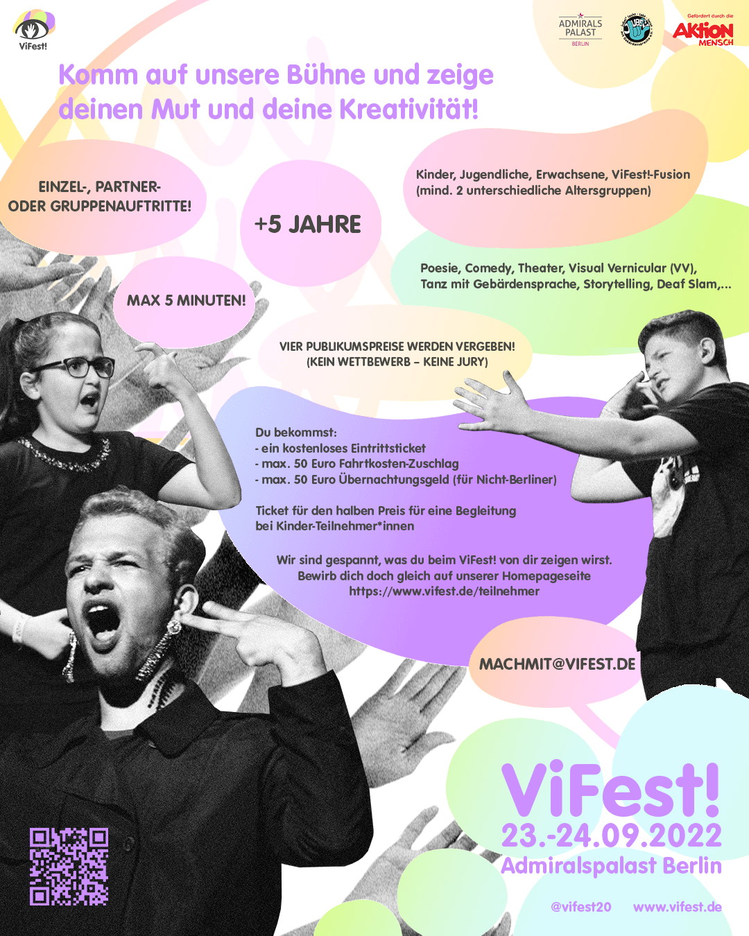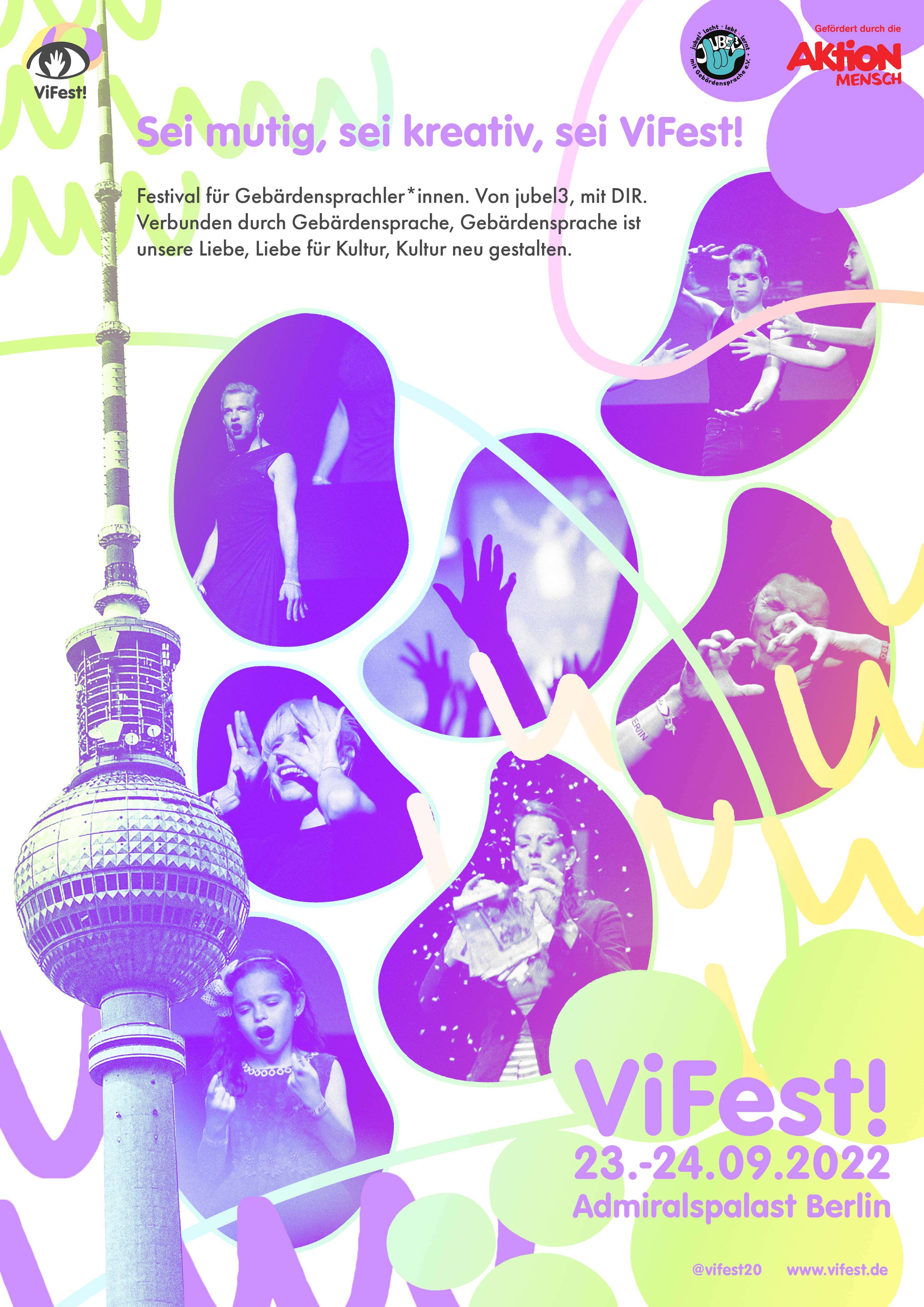 Das ViFest! ist ein Festival für Gebärdensprachler*innen, welches erstmalig am 26. und 27. April 2019 in der Urania Berlin stattgefunden hat. Bei der inklusiven Veranstaltung sind alle Personen willkommen, die in Gebärdensprache kommunizieren oder an ihr interessiert sind. Dabei spielt es für uns keine Rolle, ob jemand jung, alt, hörend, schwerhörig, ertaubt, CI-Träger*in oder Coda ist. Die Türen stehen für alle offen.